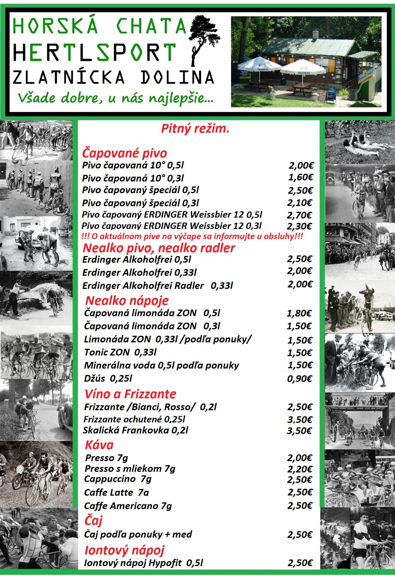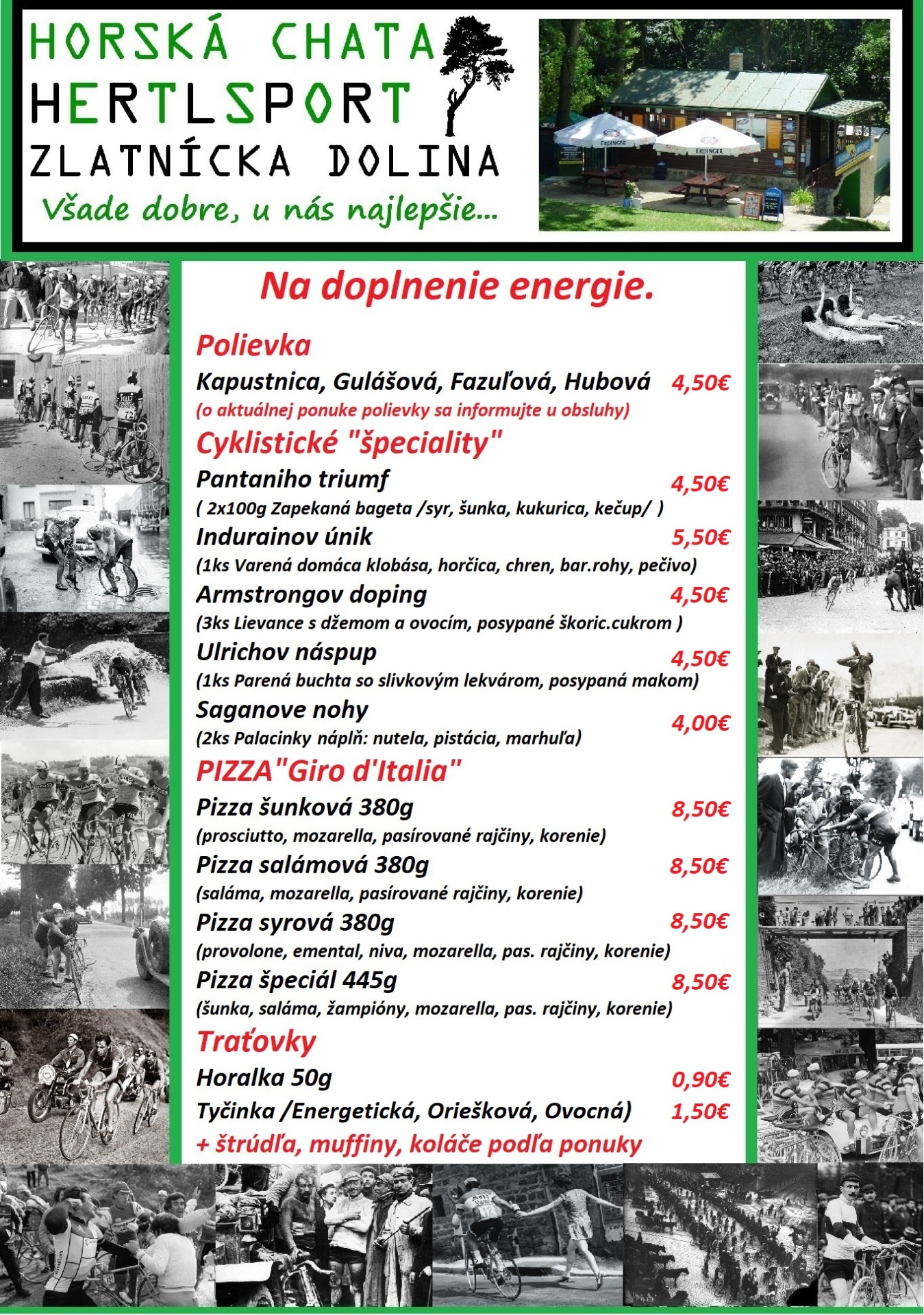 Súčasťou jedálneho lístka sú obľúbené "cyklistické špeciality", ako domáca klobása, nakladaný hermelín, pizza, palacinky, parená buchta, lievance, polievky a ďalšie dobroty.