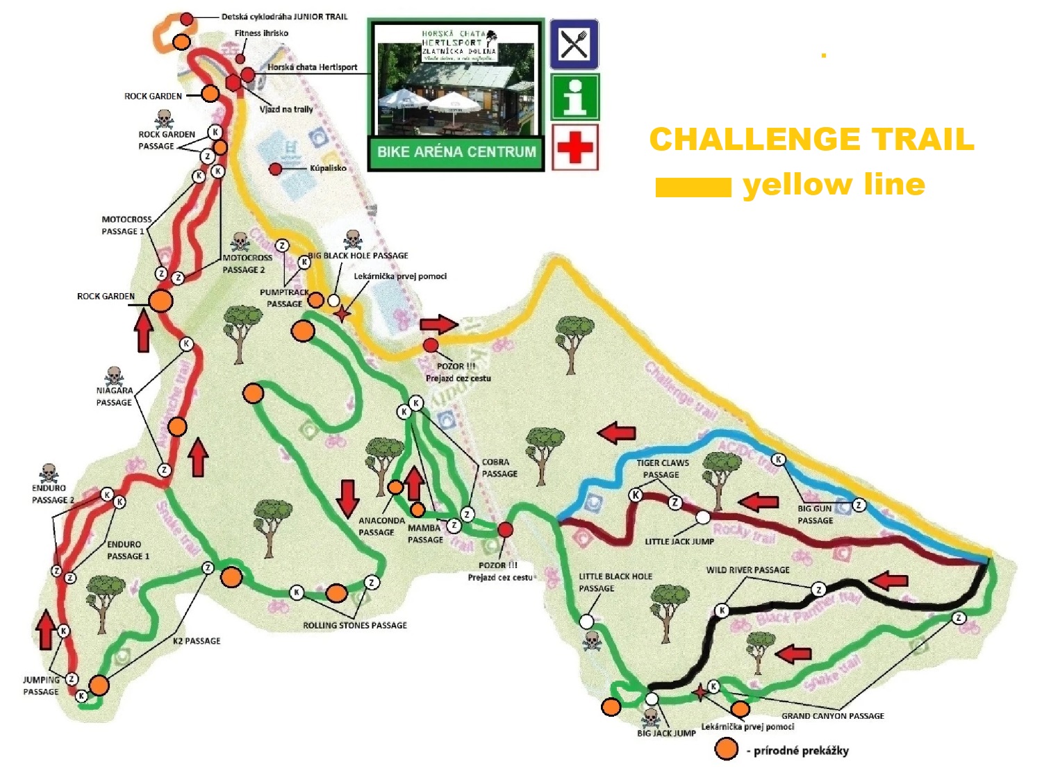 CHALLENGE TRAIL /yellow line/- je značený žltou farbou. Jedná sa zvlnený a stúpací trail. Tvorí ho úsek s prvkami pumptracku /PUMPTRACK PASSAGE/ , technicky náročný prudký zjazd k potoku /BLACK HOLE PASSAGE -tento úsek sa dá obísť menej náročnou trasou/ , prejazd cez stavidlo potoka a dlhý stúpací úsek. Patrí k menej technicky náročným trailom.