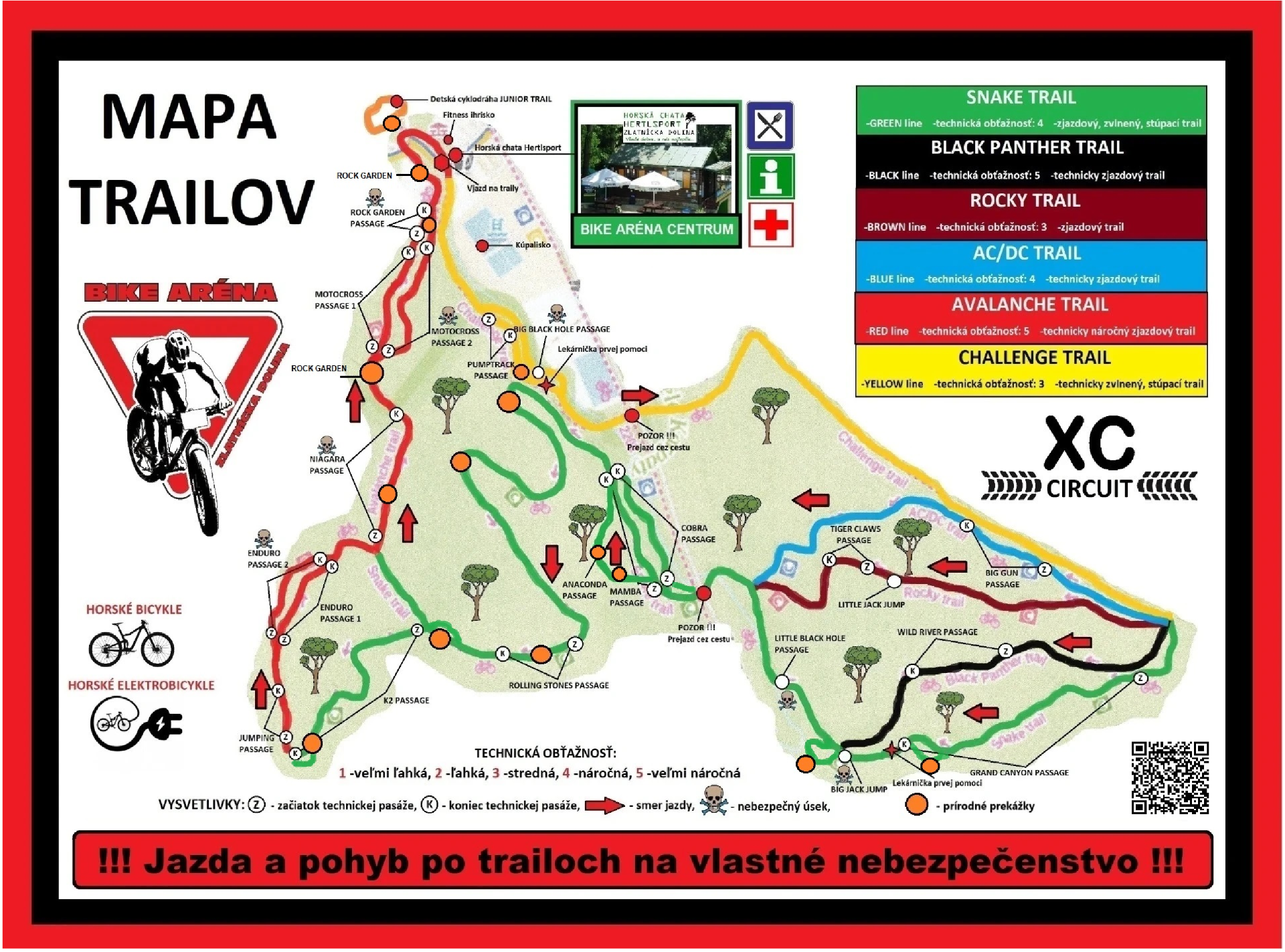 CHALLENGE TRAIL /yellow line/ - je značený žltou farbou. Jedná sa zvlnený a stúpací trail. Tvorí ho úsek s prvkami pumptracku /PUMPTRACK PASSAGE/ , technicky náročný prudký zjazd k potoku /BLACK HOLE PASSAGE -tento úsek sa dá obísť menej náročnou trasou/ , prejazd cez stavidlo potoka a dlhý stúpací úsek. Patrí k menej technicky náročným trailom.